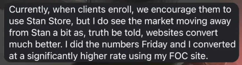 We used to recommend Stan Store, but after running the numbers, we saw FOC converted at a significantly higher rate. The market is clearly shifting, and honestly, funnels just convert better. FOC is the way forward.